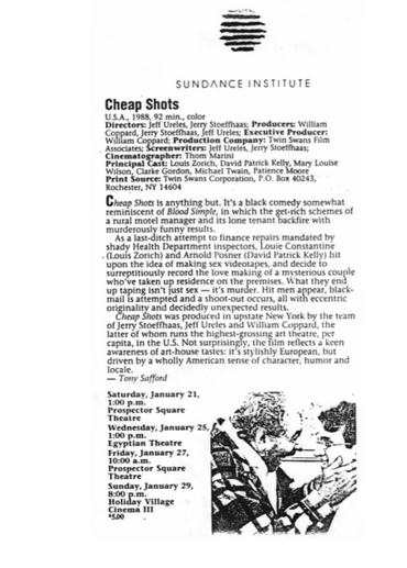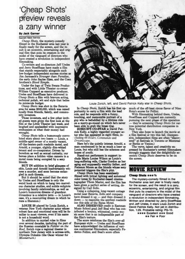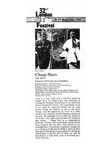CHEAP SHOTS was produced in upstate New York by the team of Jerry Stoeffhaas, Jeff Ureles and William Coppard, the latter of whom runs the highest-grossing art theatre, per capita, in the U.S. Not surprisingly, the film reflects a keen awareness of art-house tastes: it's stylishly European, but driven by a wholly American sense of character, humor and locale.